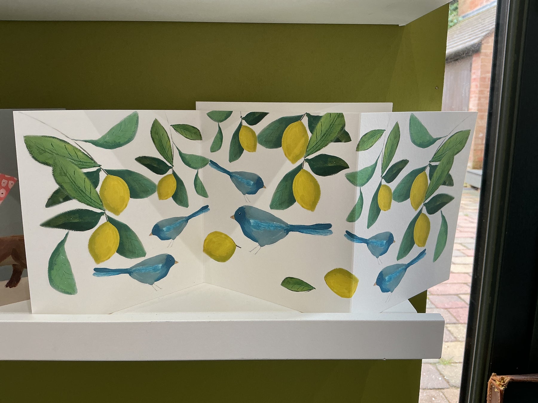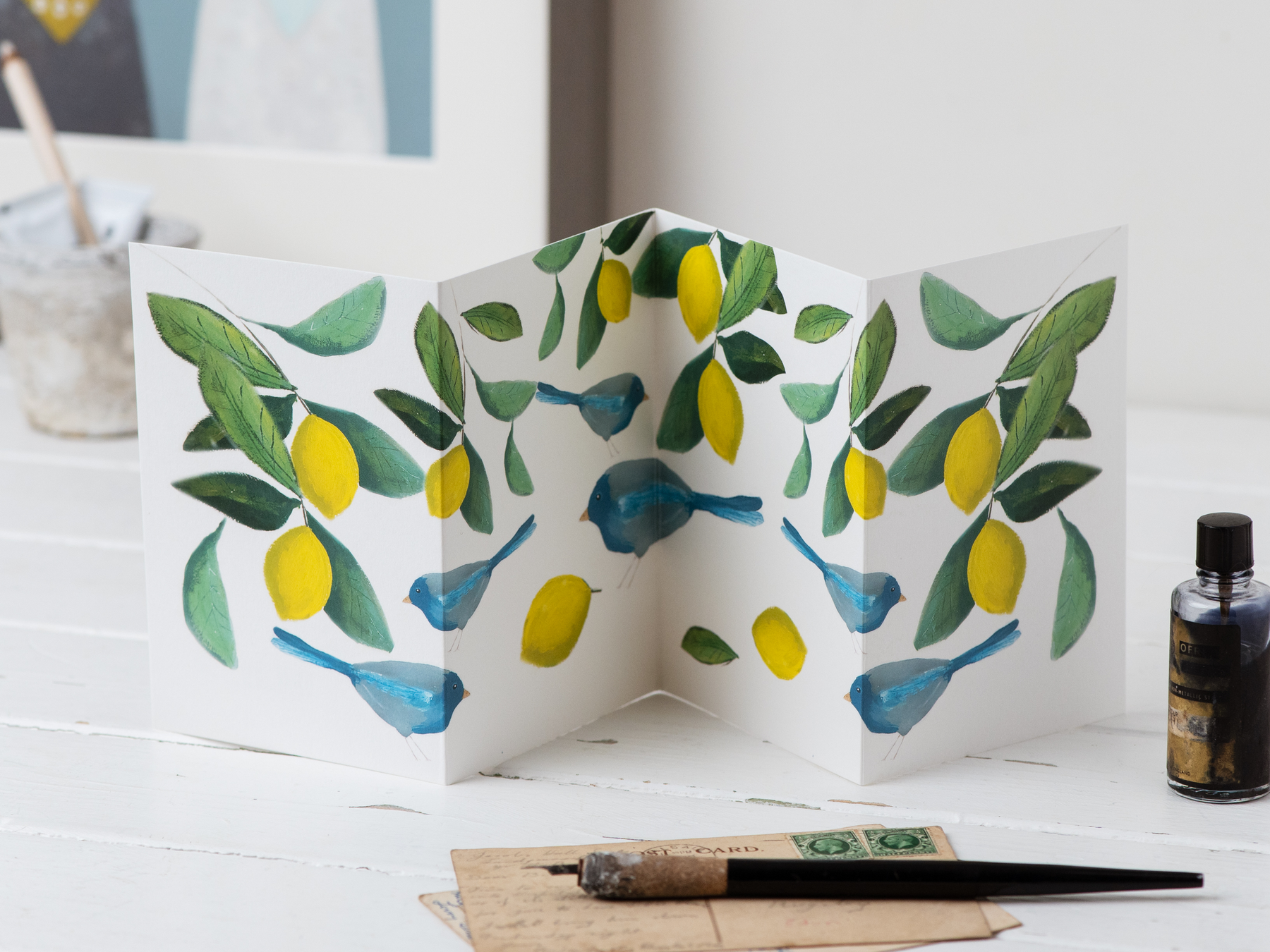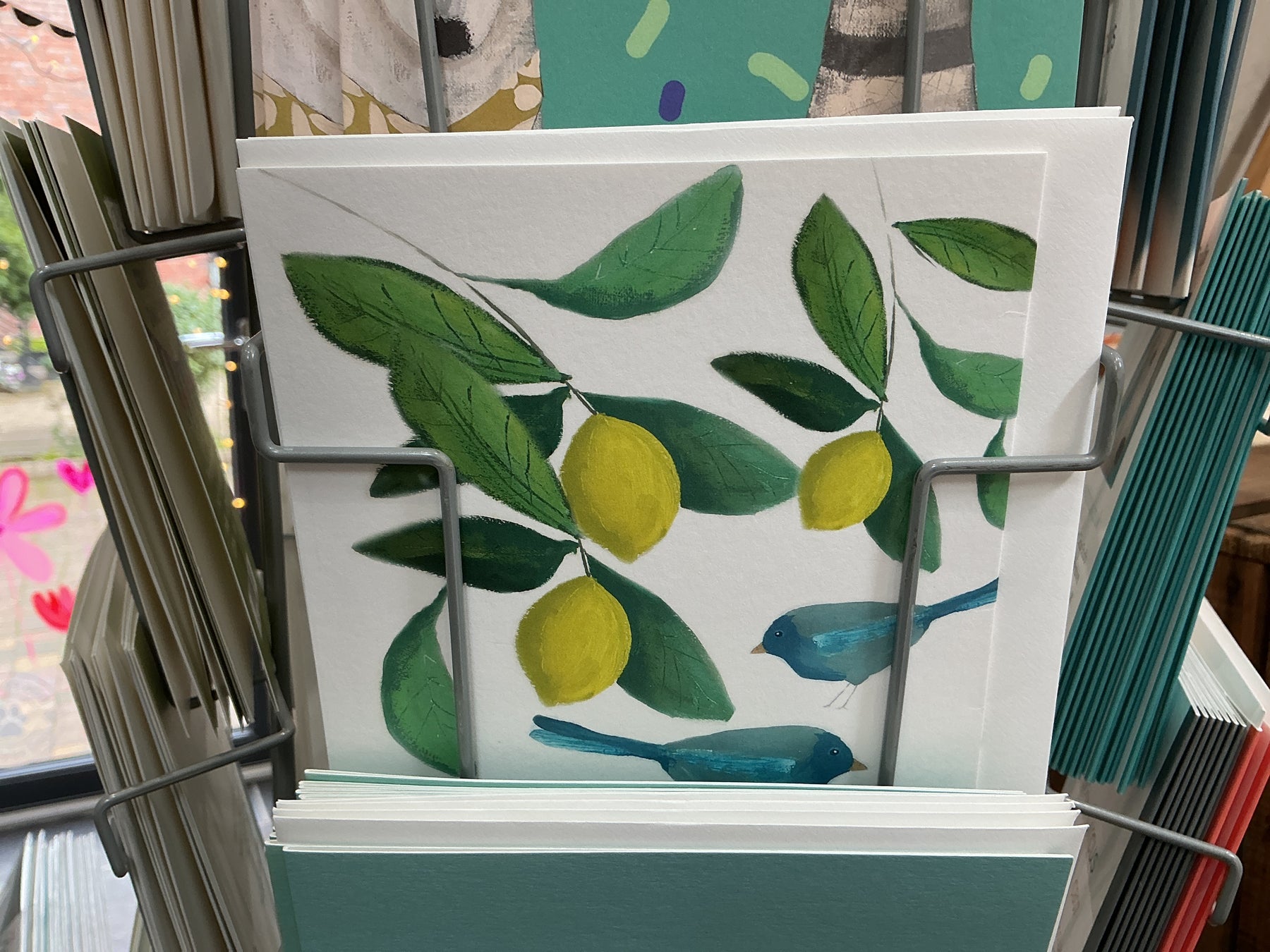 A6 sized folding card featuring the Lemon Tree with Birds design. Blank inside for your own message.