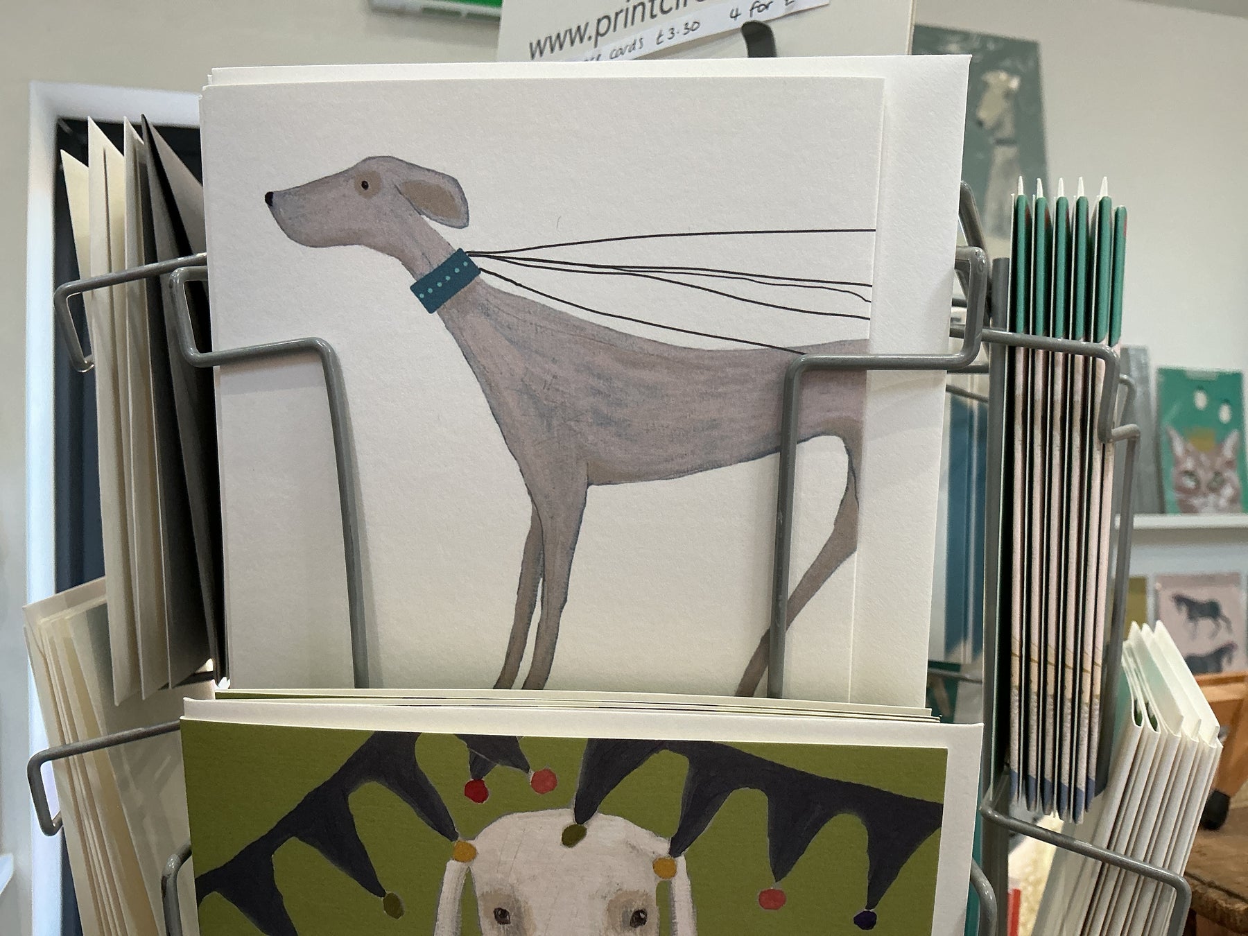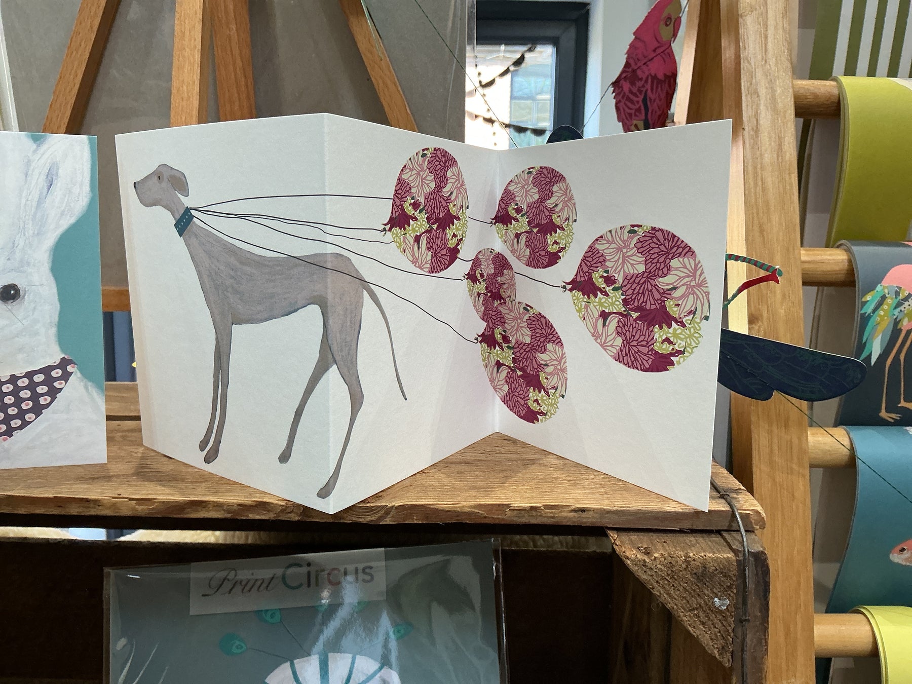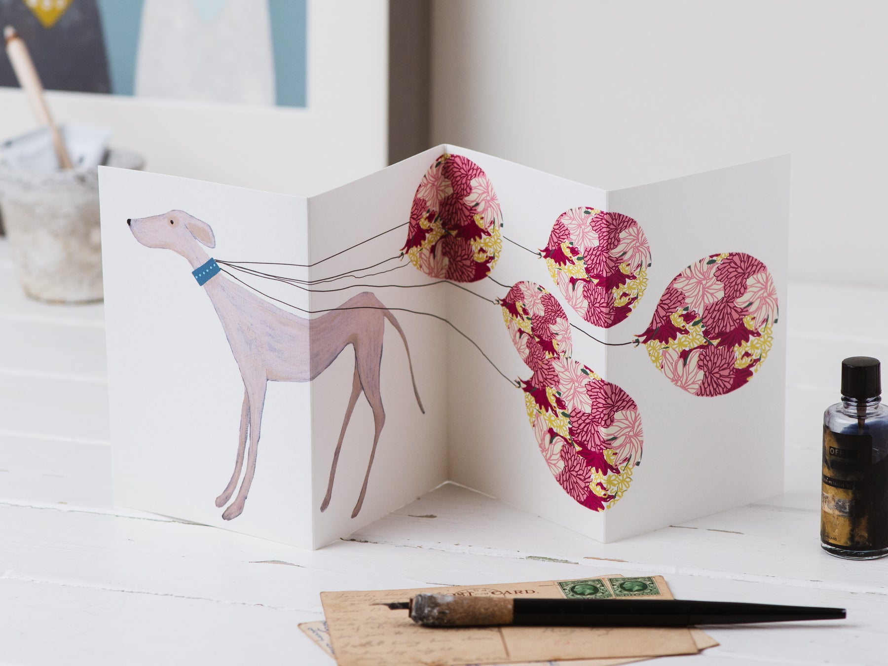 A6 sized folding card featuring the Hound with Patterned Balloons design. Blank inside for your own message.