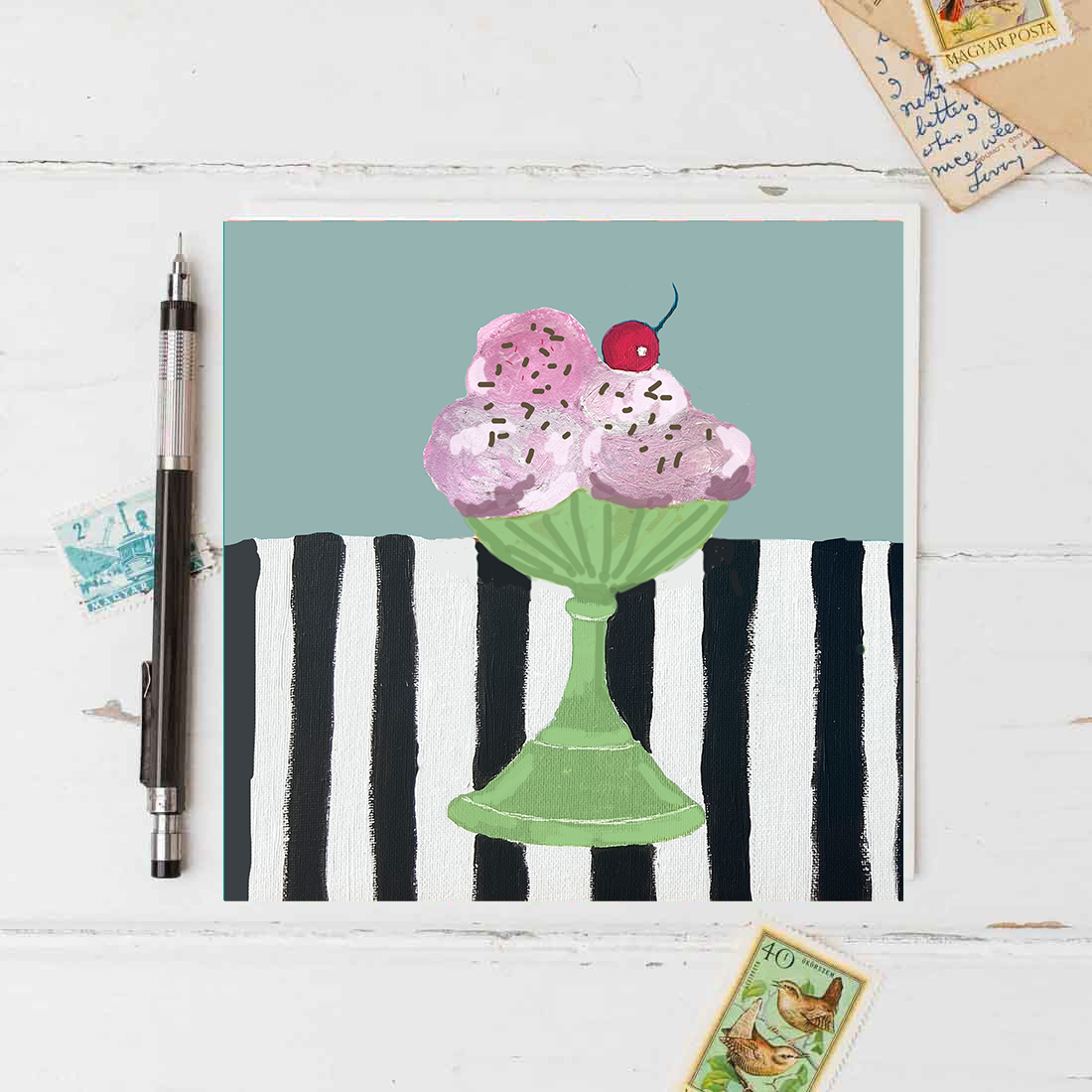 Chocolate Sundae 15x15cm square greetings card. Blank inside for your own message, complete with ivory envelope.